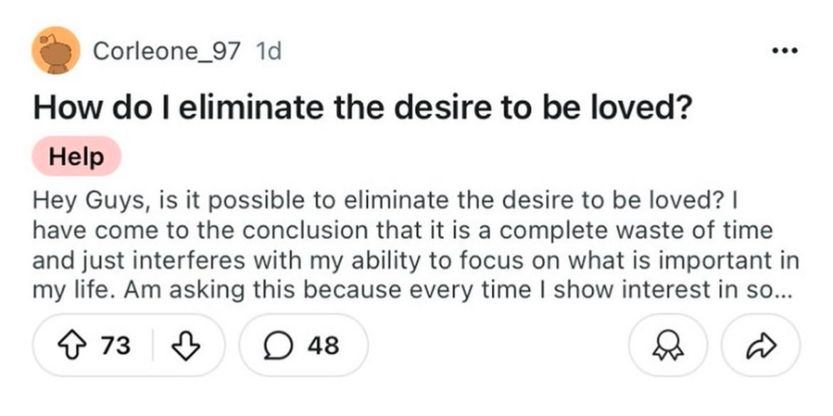One day, towards the end of last year, the above screenshot appeared on my Instagram feed. “How do I eliminate the desire to be loved?” was its plaintive question; my initial response was a wry smile, lapsing into sympathetic, slightly amused, pity. It seemed almost ridiculous that anybody would seek instruction for an endeavour I considered so fruitless, and yet my heart went out to the poor Redditor. After all, their predicament was one I knew well: too many of my teenage years were spent longing for love while simultaneously longing to care less about it. I can certainly sympathise with the circumstances that cause someone to ask such a question, even if I’m not as desperate for an answer anymore. Still, I began to think: if we eliminate the desire to be loved, what else are we losing? Is it even possible to rid ourselves of it, and should we try?